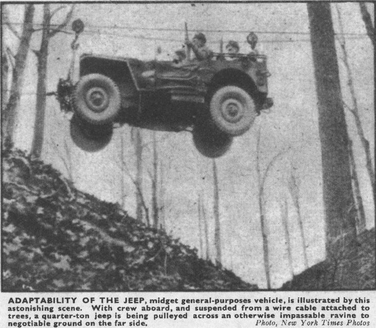 I'm betting that ravine meets at a very acute angle at the bottom. Even a Jeep has limitations.FBM wrote:Or just plow right thru. Those willys were 4WD, right? Give it some throttle and see what happens.Gawdzilla wrote:Too much angle in the dangle.FBM wrote:Looks like the bottom of the front pulley is lined up with the bottom cable. Who be needin' glasses?Anyway, the sag isn't enough to make me at all happy with that stunt. It would seem to be faster to just go the fuck around that gulley.