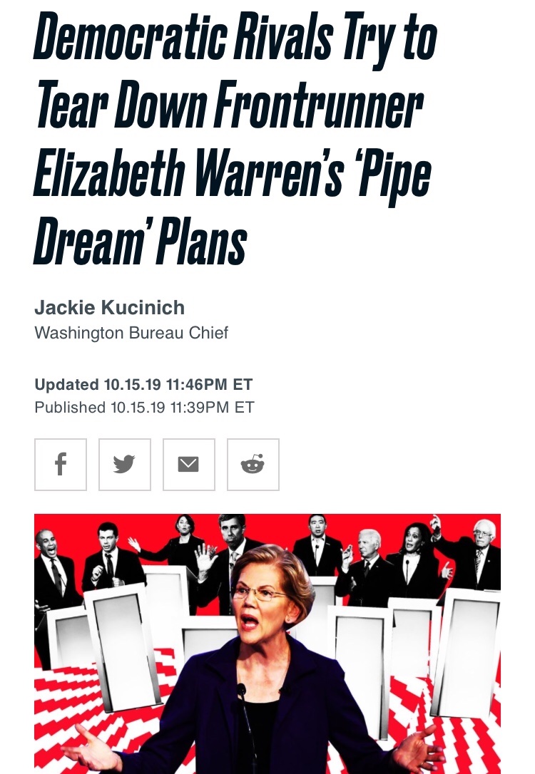 https://thehill.com/homenews/campaign/4 ... nally-pollSen. Elizabeth Warren (D-Mass.) has opened up a 7-point lead in the 2020 Democratic presidential primary, according to a Quinnipiac University poll released Thursday.