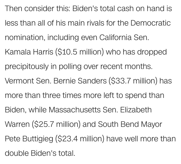 Fundraising. So Biden's total cash haul -- $15.7 million -- isn't great. (He was outraised by Sanders, Warren and Buttigieg.) But his burn rate -- the amount he spent -- is even more concerning. Biden spent more than $17.6 million, meaning $2 million more went out than came in. Which is bad! But could be mitigated somewhat if Biden had previously stocked away a Scrooge McDuck-like set of gold coins (or just plain dollar bills) that he could draw from to fund his efforts in the third fundraising quarter.