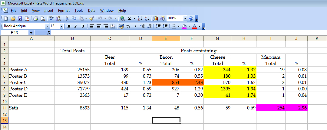 Just out of curiosity, I decided to conduct a little experiment. I chose five other posters at random (I won't name them here), and decided to test what percentage of their posts contain certain words. The following table is informative (screen shot taken from my Excel spreadsheet):