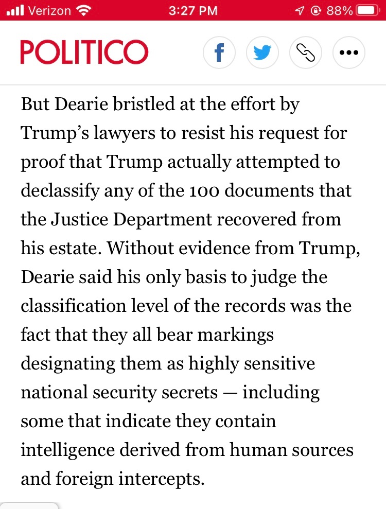 Judge Dearie, the man Trump asked to be special master, is attempting to pull him back into the real world. He has instructed Trump to swear an affidavit, under penalty of perjury, attesting to the same things he has been saying on social media and in the press/on TV (he declassified the documents, the document were planted by the FBI etc) or to withdraw those claims.