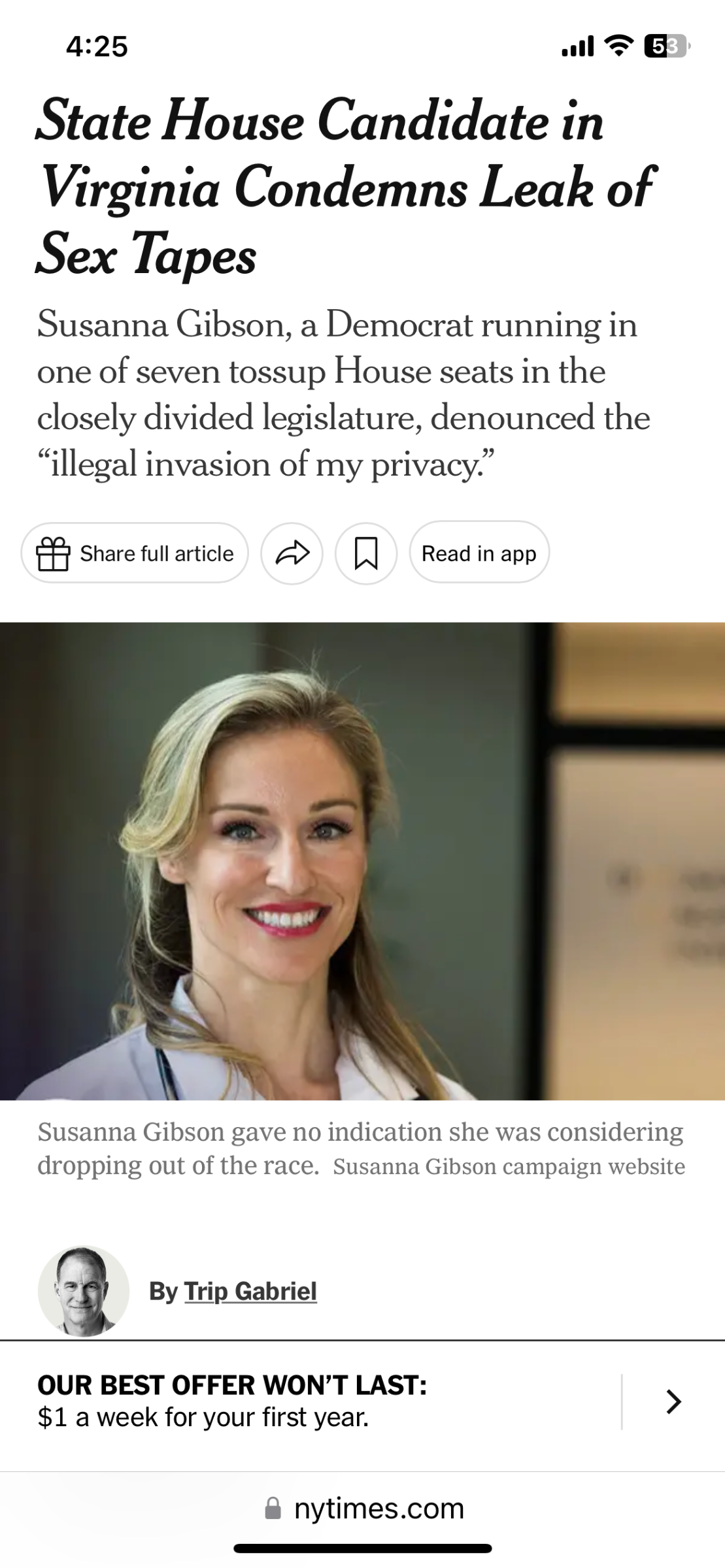 ...but the sensational nature of the disclosure of sex tapes — reportedly featuring Ms. Gibson and her husband, a lawyer — is highly unusual. Ms. Gibson called the release of the tapes “the worst gutter politics.” The Post said it learned of the material from a “Republican operative” who denied a connection to Ms. Gibson’s opponent...