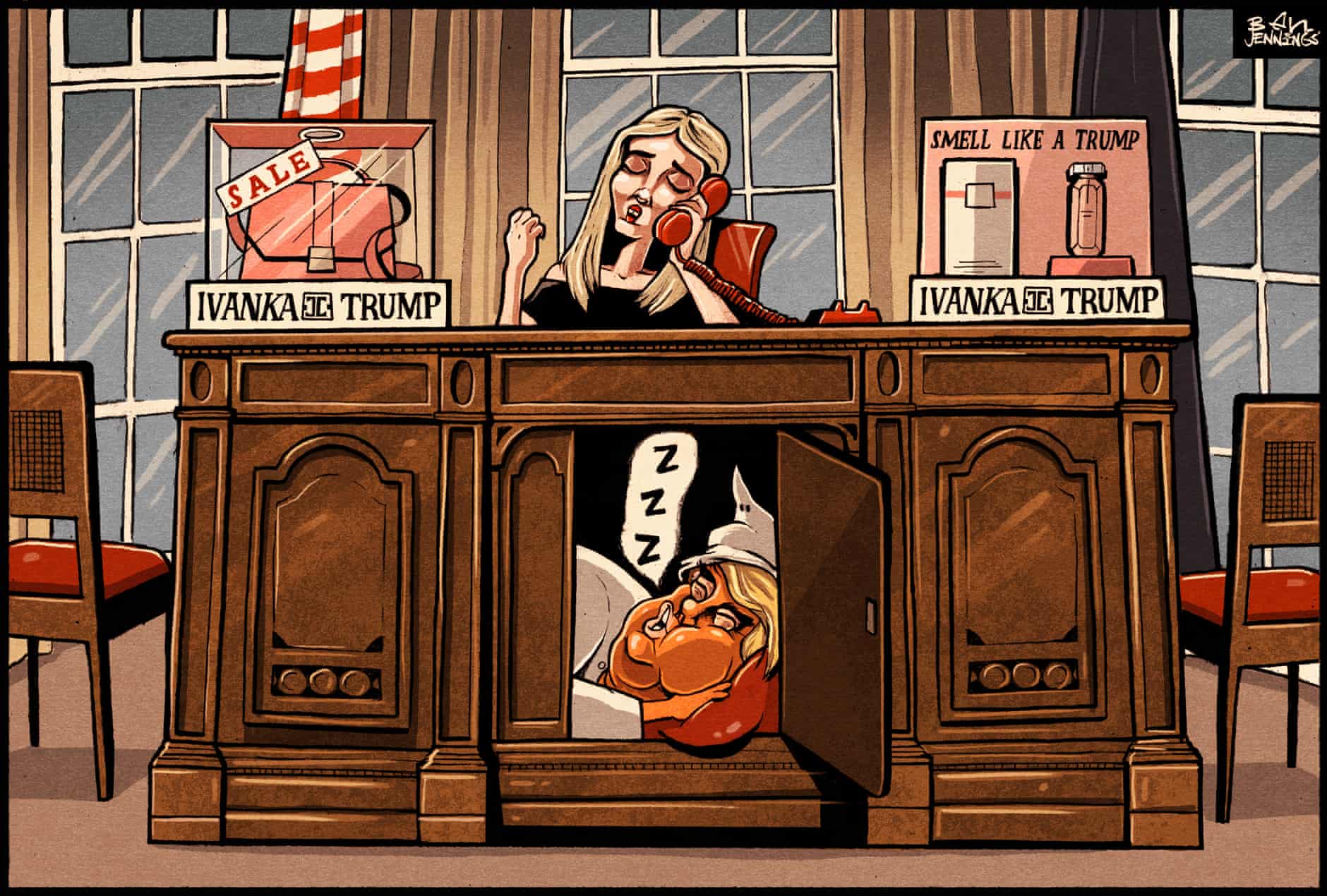 Do they just recycle these cartoons? Every Republican President since Nixon is always a figurehead with the real power held by some other figure.... with Trump it waffles between Bannon and Ivanka nowadays. With Bush it was Karl Rove or Dick Cheney, with Bush as the puppet. With Bush the Elder it was Dick Cheney and James Baker. With Reagan it was Alexander Haig, Nancy Reagan and their astrologer.Scot Dutchy wrote: