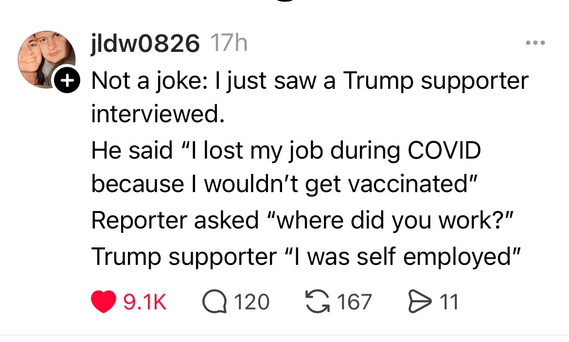 Yeah, seems like an easy target, but the guy could've been a contractor and lost work because he wouldn't get vaccinated.