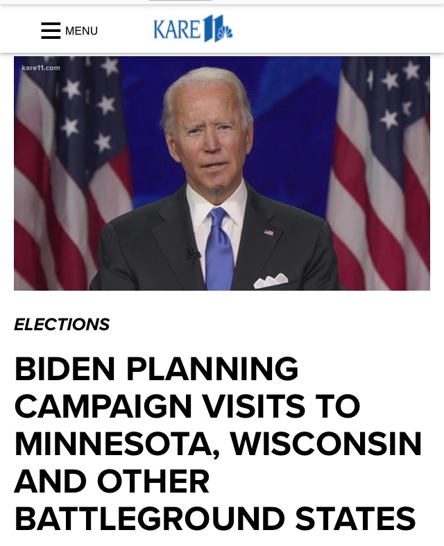 WASHINGTON — Democratic presidential nominee Joe Biden says he's planning to hit the campaign trail - in person - after Labor Day, including likely visits to Minnesota, Wisconsin, and other critical battleground states.
