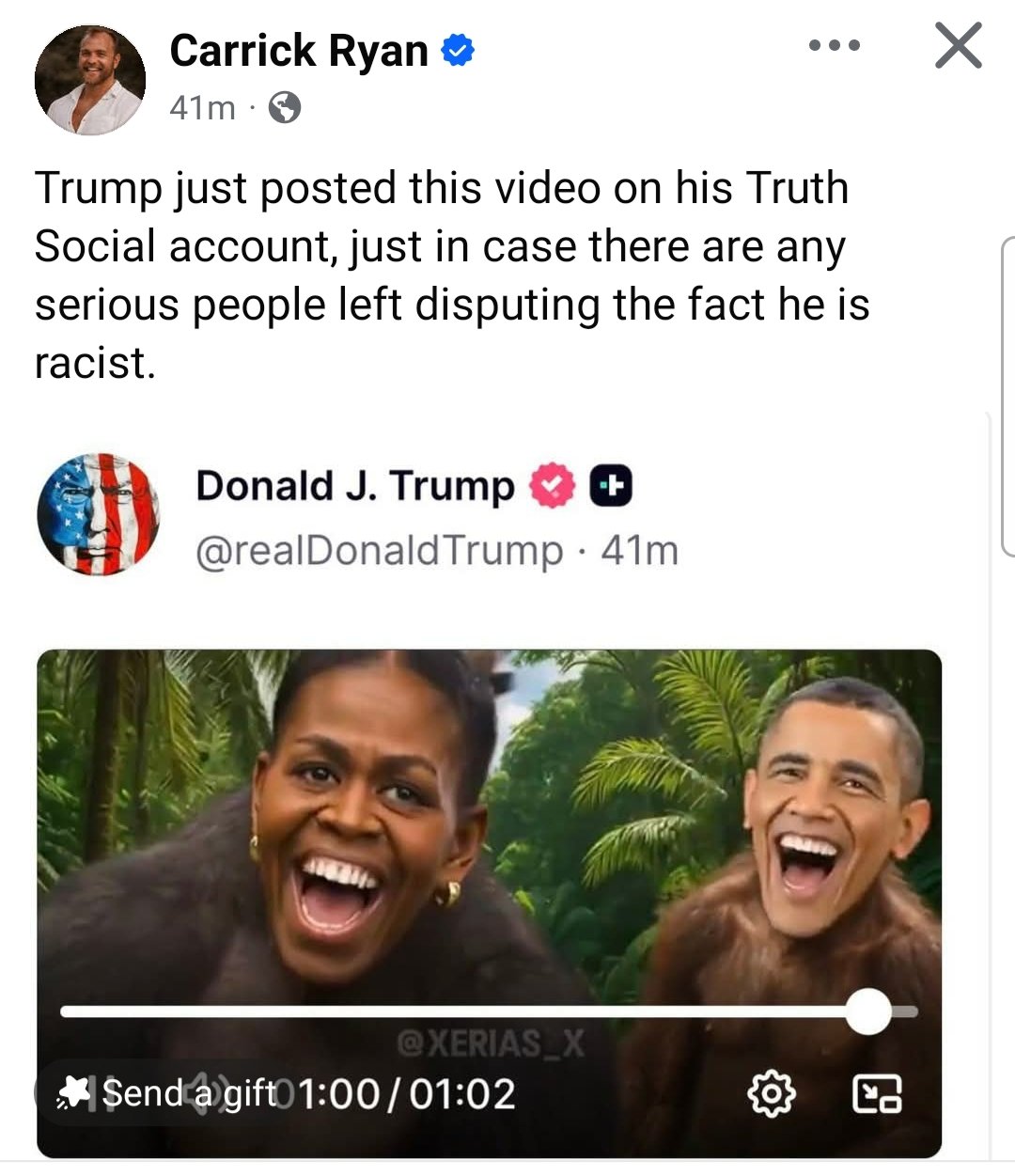 To provide some context: Trump didn't create the video just shared it. The end bit with the Obamas is from Twitter account @xerias_x which posts a lot of ai videos with hateful messages.