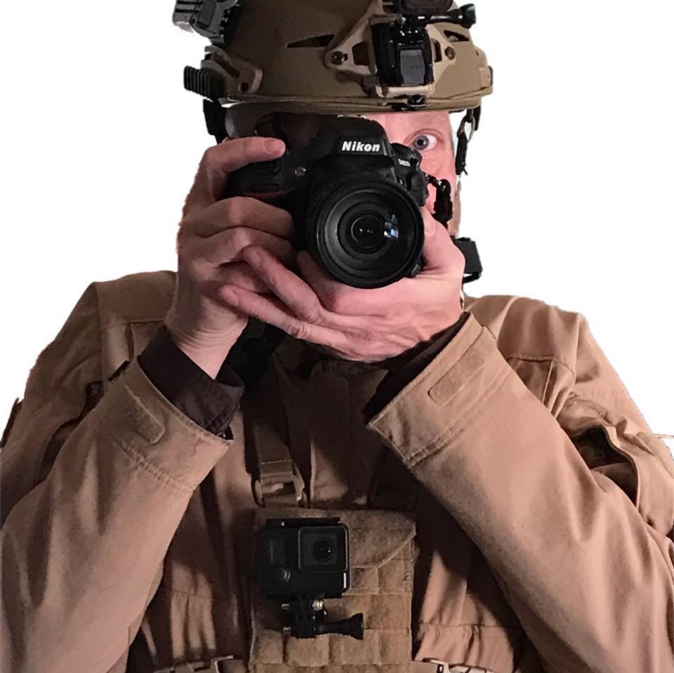 It's urban combat journalism at its finest. You should have seen me at the Democrat National Convention in Denver in 2008, I had full Kevlar Level IIIA, Kevlar helmet, shin guards, steel-toed combat boots, HD video mounted to the body armor, remote shotgun mic for the video on one shoulder like a parrot, battery powered video light on the other all attached to the MOLLE loops with remote controls. Nikon digital camera, digital sound recorder, gas mask, cup, the whole shebang. I was the hit of the press pool, everybody was so jealous.