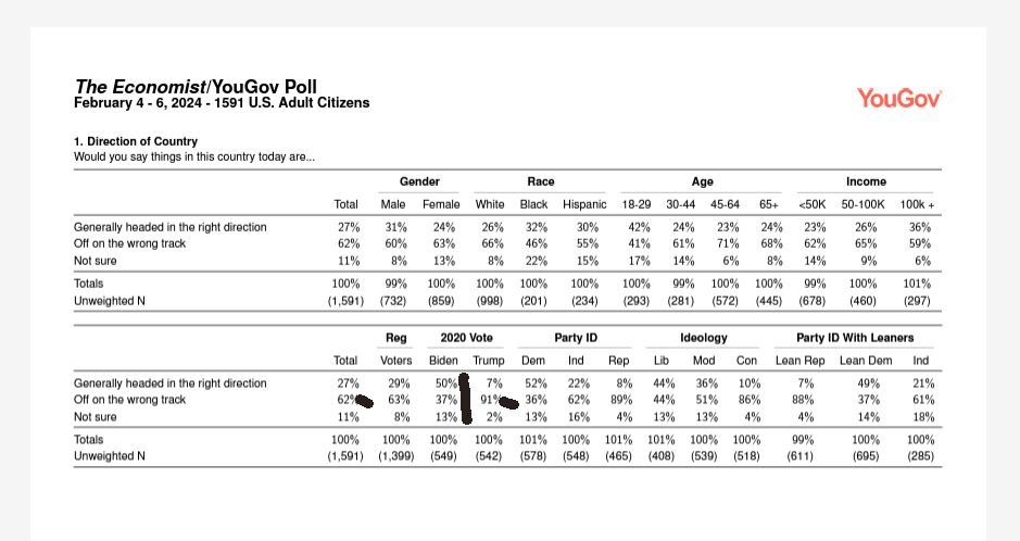 the Trump voters, 90% of them, are unhappy with "how things are going." They would not ever be happy. Bread and gas cost more, Biden is at fault. I put some marks on it to add up Biden votes. Over 60% are OK with economy. Not a good number for your own party. And some 35% of independents are happy or at least OK. But will they show up to vote?