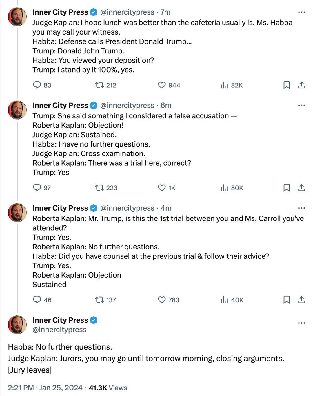 Court: "The jury found Mr. Trump inserted his fingers into her vagina. Ms. Carroll did not make up her claim. Mr. Trump's June 11 & June 22 statements were defamatory. Now, Mr. Trump may not make any argument against this.”