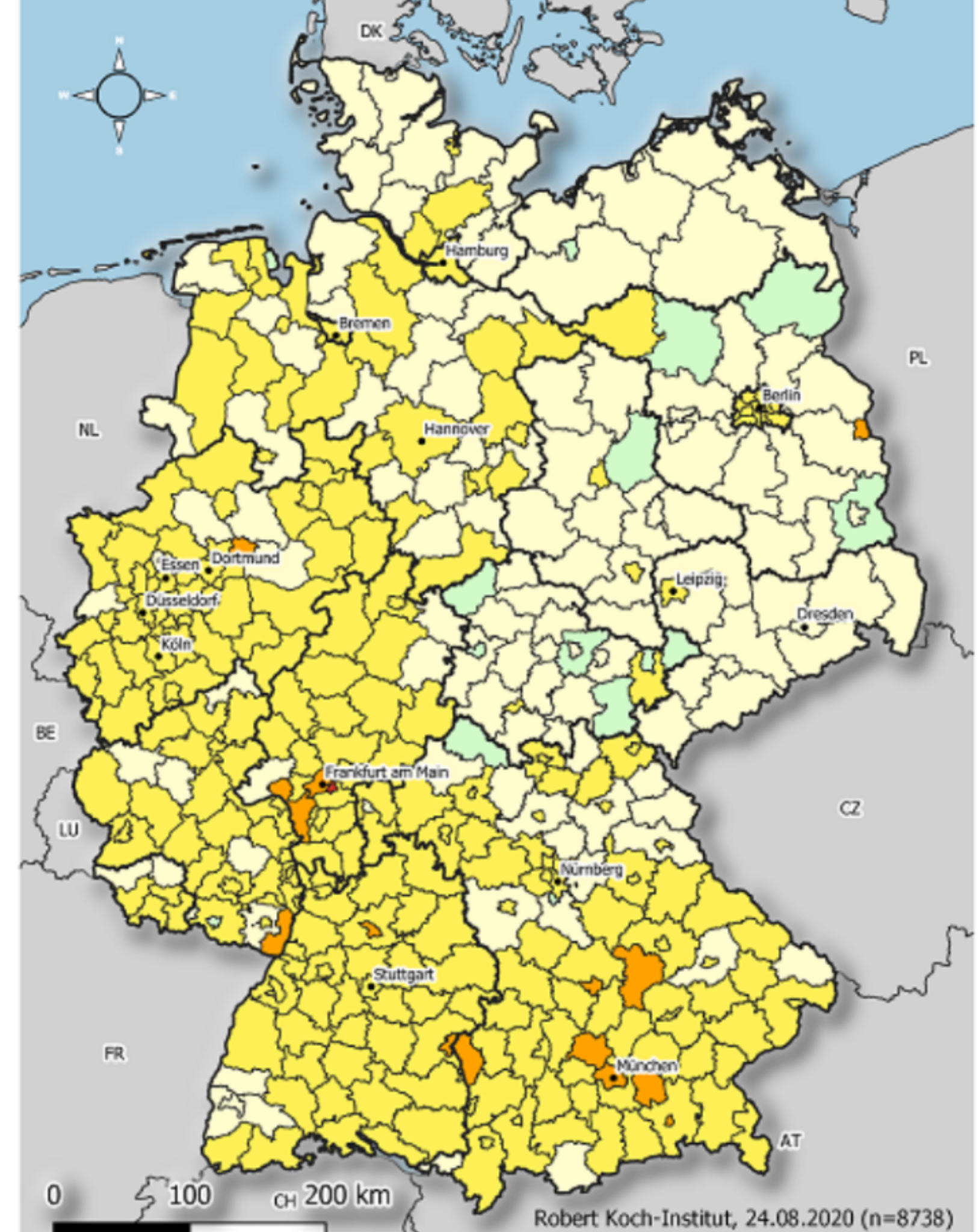 Map showing the relative number of infections over the last week. Even 30 years after German reunification, you can still make out differences between East and West