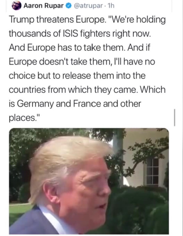 Well, well, well, well, Europe can breathe a sigh of relief if the thousands of ISIS fighters Trump threatens to release in Europe will flood Germany and France instead.