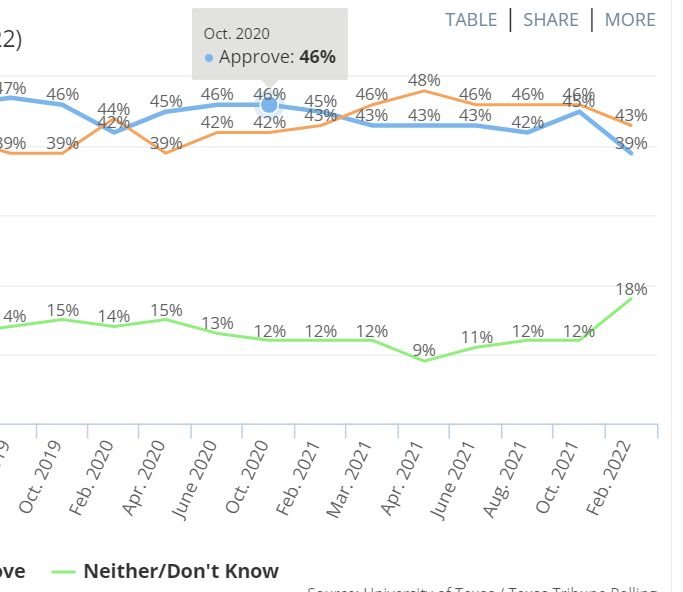 Ted Cruz approval below Biden's, at 39%. Strangely, 18% do not know.