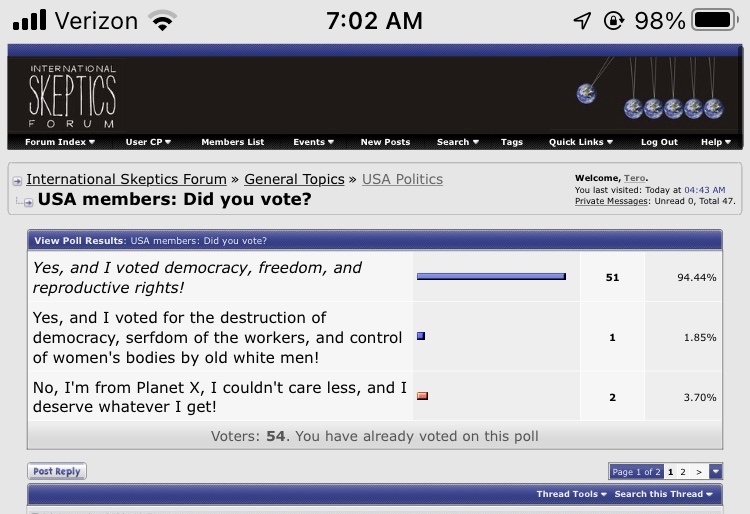 Yeah, they did better than expected. We’re all happy they even have a shot at keeping both majorities. But they’ll still be undermined by less than perfect agreement on every vote, and they only just held after half the country lost what had been considered a right.Brian Peacock wrote: ↑Sun Nov 13, 2022 4:09 pmI guess not losing is a kind of win? Kinda? History suggested that the Dems would take an inevitable drubbing in the midterms, so the fact that that doesn't seem to have happened feels like a bit of a bonus.Sean Hayden wrote: ↑Sun Nov 13, 2022 2:19 pmIt is. I guess we’ll have to wait to start seeing honest reviews. Today I came across a headline saying something like Democrats win because of young voters. At least in that article they did mention turnout was actually lower among the youngest, they just voted overwhelmingly for Democrats. The party lost every other group…pErvinalia wrote: ↑Fri Nov 11, 2022 1:38 amYeah it's a bit bizarre Democrats acting like they won. Yes they did better than expected, but they still lost (the House, at least).