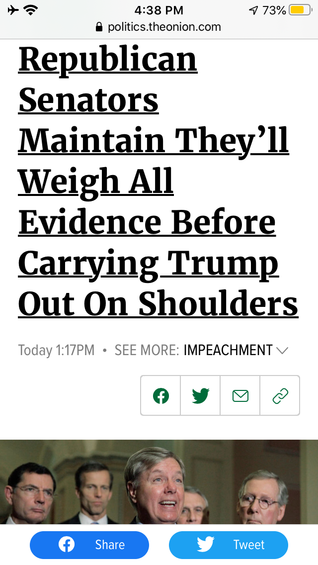 we will storm into the Oval Office, hoist the delighted president aloft, and regale him with spirited rounds of ‘Hip, hip, hurray,’” said Sen. Mitch McConnell, noting that his awesome responsibility as the chamber’s majority leader required him to tamp down on any partisan speculation on whether Senate Republicans would rush to raise the president up onto their shoulders while singing “He’s A Jolly Good Fellow” or if Senate Republicans would opt for a more stately procession in which they conveyed the recently acquitted Trump past each and every Democratic congressperson’s office. “