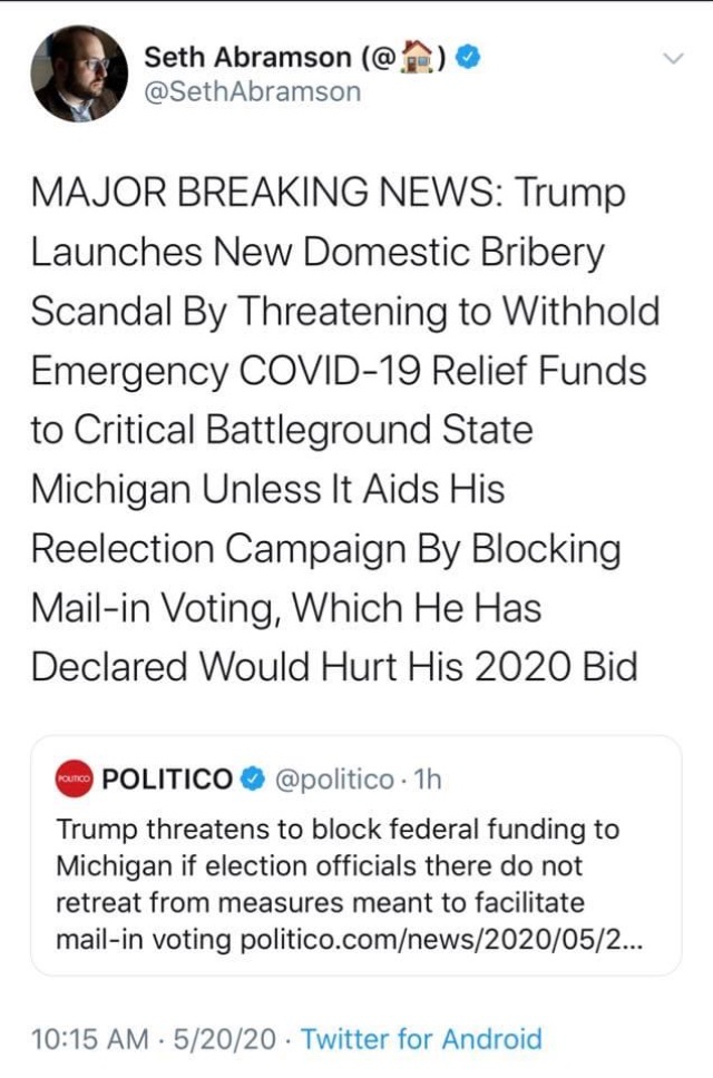 Nobody is trying to go to vote-by-mail exclusive of in-person voting, though there are states that already have that, and have had it for years. What states like Michigan and Nevada are trying to do is expand their vote-by-mail capacity. Neither of them is proposing to eliminate in-person voting.Cunt wrote: ↑Thu May 21, 2020 4:16 amMail-in voting. One side is 'turn the whole voting system to mail-in voting', and the other is 'keep in-person voting'.