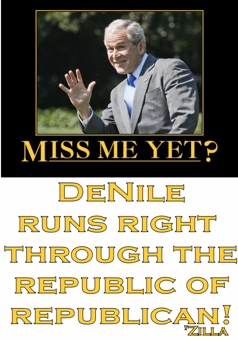DeNile runs right through the Republic of Republican.Svartalf wrote:I know that... just was trying to keep the conversation at a level that might not demand he answer from deep lalaland.Gawdzilla Sama wrote:Svartalf wrote:Well, I'm not sure if Aghanistan did anything much to bother AQ ops, but Iraq sure did none, and did more harm than good, and if W had a mandate from DoG to eliminate dictators, I notice a whole lot of them that were left unbothered, starting with Kim (NK) and Lukashenko (Belarus).