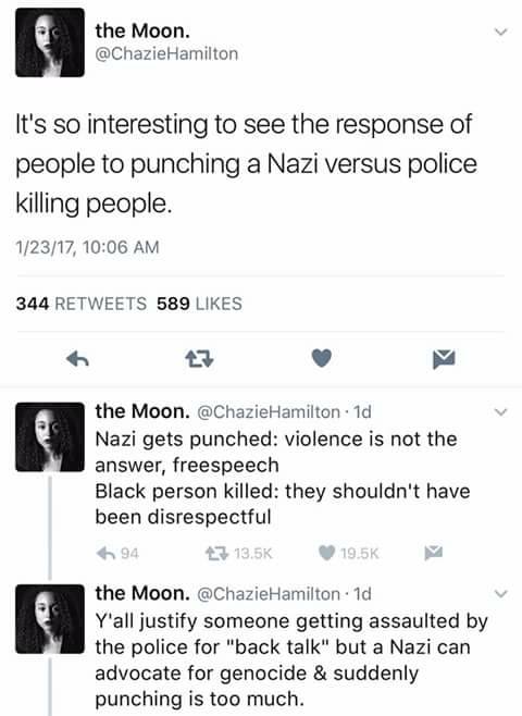 But, my point was that when a person says it's good to punch Nazis, they are assuming what is almost always a disputed issue - whether the person is/was a Nazi in the first place. I've seen fuckwits like that asshat Steve Shives on Youtube suggest that people who "carry water" for Nazis or white supremacists are just as bad, and deserve the same treatment. So, it's very convenient for such people to label someone a Nazi and then declare the greater good served by assault and battery of said alleged Nazi.