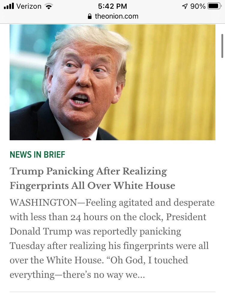 Oh God, I touched everything—there’s no way we have time to get this whole place cleaned,” said Trump, who emptied a bottle of bleach over the Resolute desk as he and a team of aides worked frantically to scrub every surface, doorknob, and square inch of the building of evidence the president was ever there. “Geez, what was I thinking? This is such a rookie mistake. I should have been wearing gloves these past four years. Oh God, and there are cameras too, aren’t there? Someone get Roger Stone over here. Maybe it’d be easier to just burn the whole place down.” At press time, Trump was carefully planting a couple of Melania’s hairs in the Oval Office.