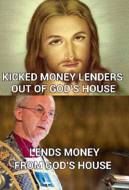 I think what gets me is that the most we get out of the Arch Bishop is that it is "embarrassing". What, that you don't know your arse from your elbow, or that you calamitously grassed on yourself? No remorse for the fact that you are financing a commercial loan shark business, just mild annoyance at making yourself look a total twat. I also love the biblical "fight fire with fire" solution to the payday loan issue. If you can't beat them with legislation, undercut them while of course making sure that you make a profit. I bet the people passing the plate along the pews are happy their money is being used to push the poor into deeper poverty. Well fucking done.