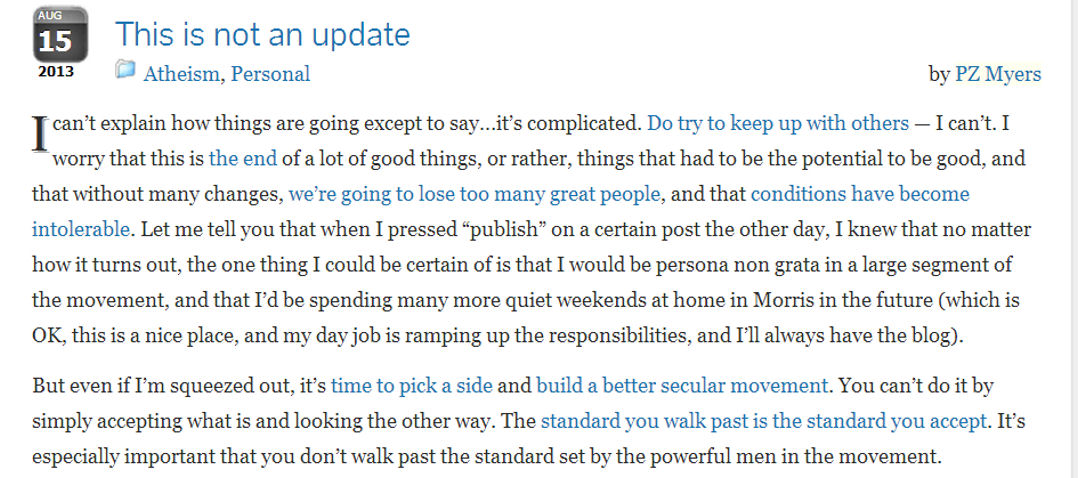 I read some of the comments after. Wow, what a scary place. It's full of victims, helpless victims, afraid of men and terrified of sexAnimavore wrote:http://freethoughtblogs.com/pharyngula/ ... an-update/