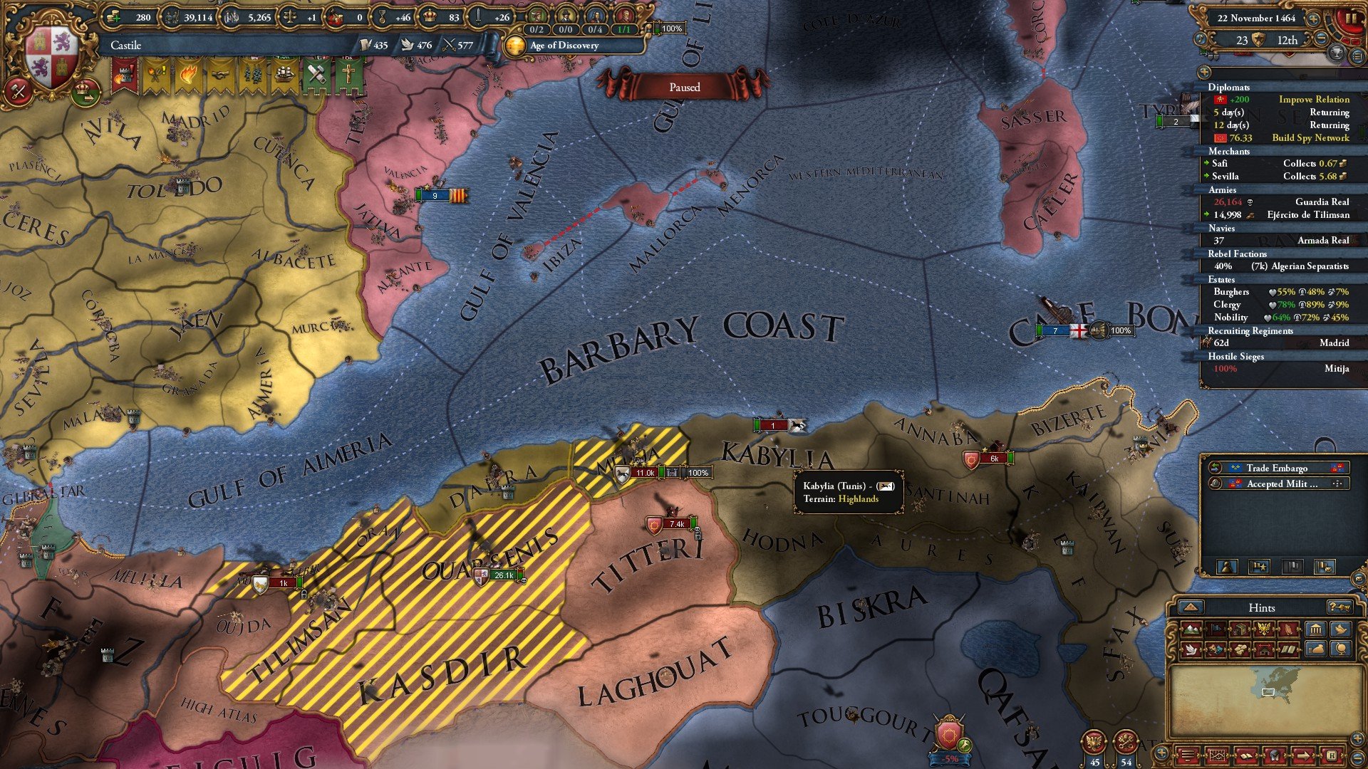 So after watching 11 half hour tutorials on Europa Universalis IV, I've got the basics of the game sorted I think. So I started a game. Started off well by conquering Granada from the heathen (Moors) to add to my territory (I'm Castille - basically Spain with the eastern portion under other's control (Aragon)). So I thought, what's next? Attack Morocco. It seems I may have over-extended myself. Initially conquered a fair bit of terrain, but I've got strong uprisings at home that I need to put down, using military resources I need against a resurgent Morocco. There's a 'war score' that tracks the progress of the war. I'm currently -5%. So Morocco is doing slightly better than me. Did I make a mistake? Let's see what happens...