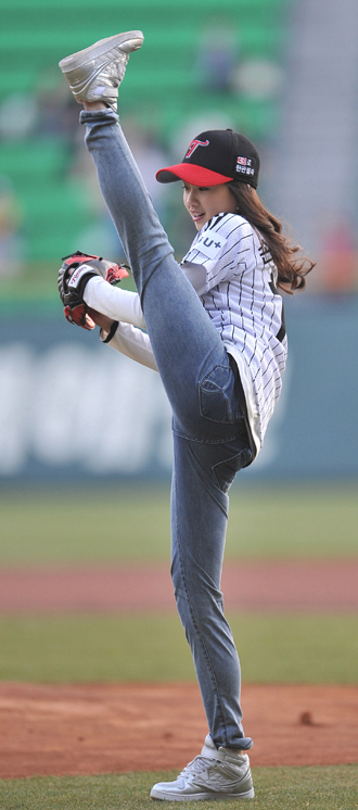 Ah. Those were local celebs throwing out the first pitch. Such as this girl, who is a...something or other gymnastic-related: