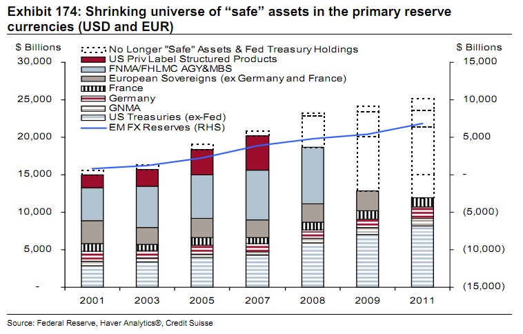 So the fact that the US is not borrowing money, which means not issuing Treasury Bonds, combined with the fact that there is also no ECB debt to invest in, means that there's lots of money out there that can't be invested. (The US Treasury Bond situation is much simpler than the European one, and would make a bigger difference, but the essence is the same).