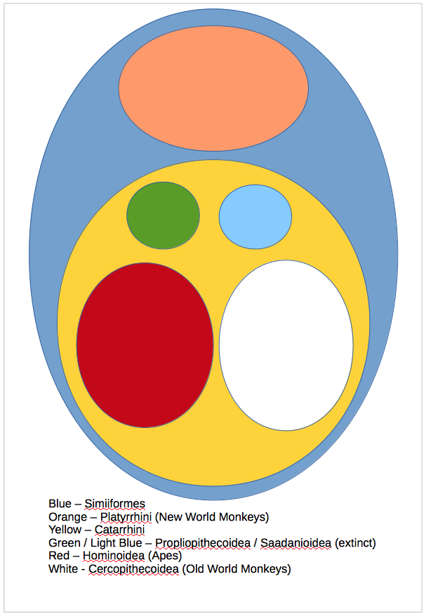 Here is a simple diagram showing the relationships within Simiiformes. You appear to be labouring under the misapprehension that when a clade divides, all of its members are divided into one new group or another. This was once the way that taxonomy worked. Nowadays, however, every clade is monophyletic and arises from a single speciation event, including that species and all of its descendants only. Picture the ovals in the diagram as the tops of inverted cones with the tip resting on a single species within the one below it (all of these groups are monophyletic clades).