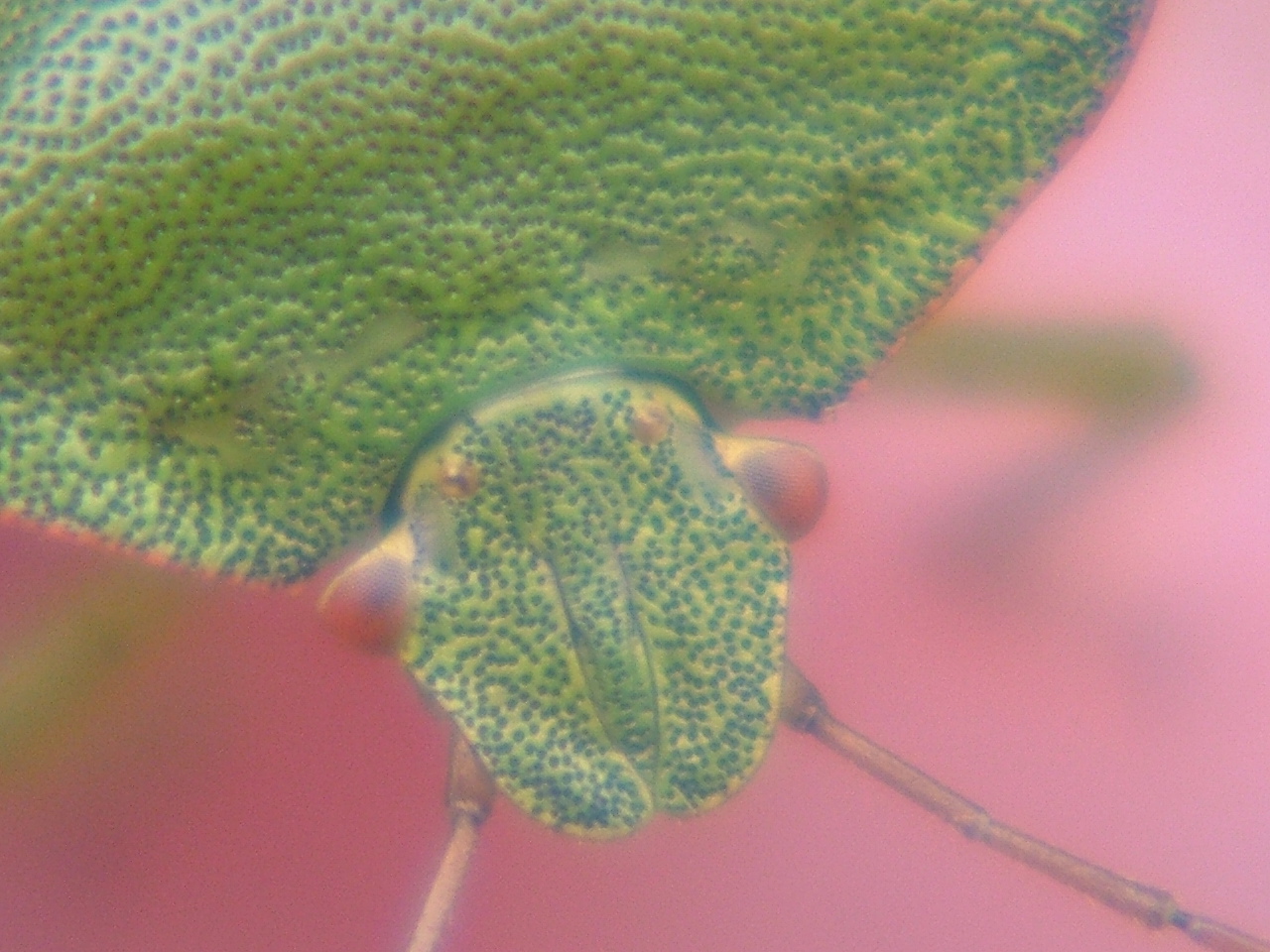 Meanwhile, how's this for a close up? Green Shield Bug, Palomena prasina, adult. Those red compound eyes are approximately ½mm in diameter.