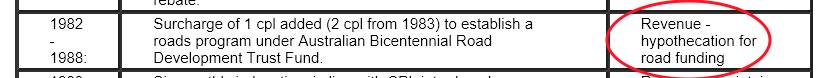 Yes, it does. Removing hypothecation turns it from a tax on road use to a tax on fuel. In an address to the Road Transport Forum Annual Convention (1999) Commonwealth Minister for Transport and Regional Services, John Anderson, agrees. He said: "Fuel excise today is a source of general revenue, just like income and other taxes." The Senate EconomicsrEvolutionist wrote:.Lack of hypothecation doesn't all of a sudden mean it isn't a tax on roads.