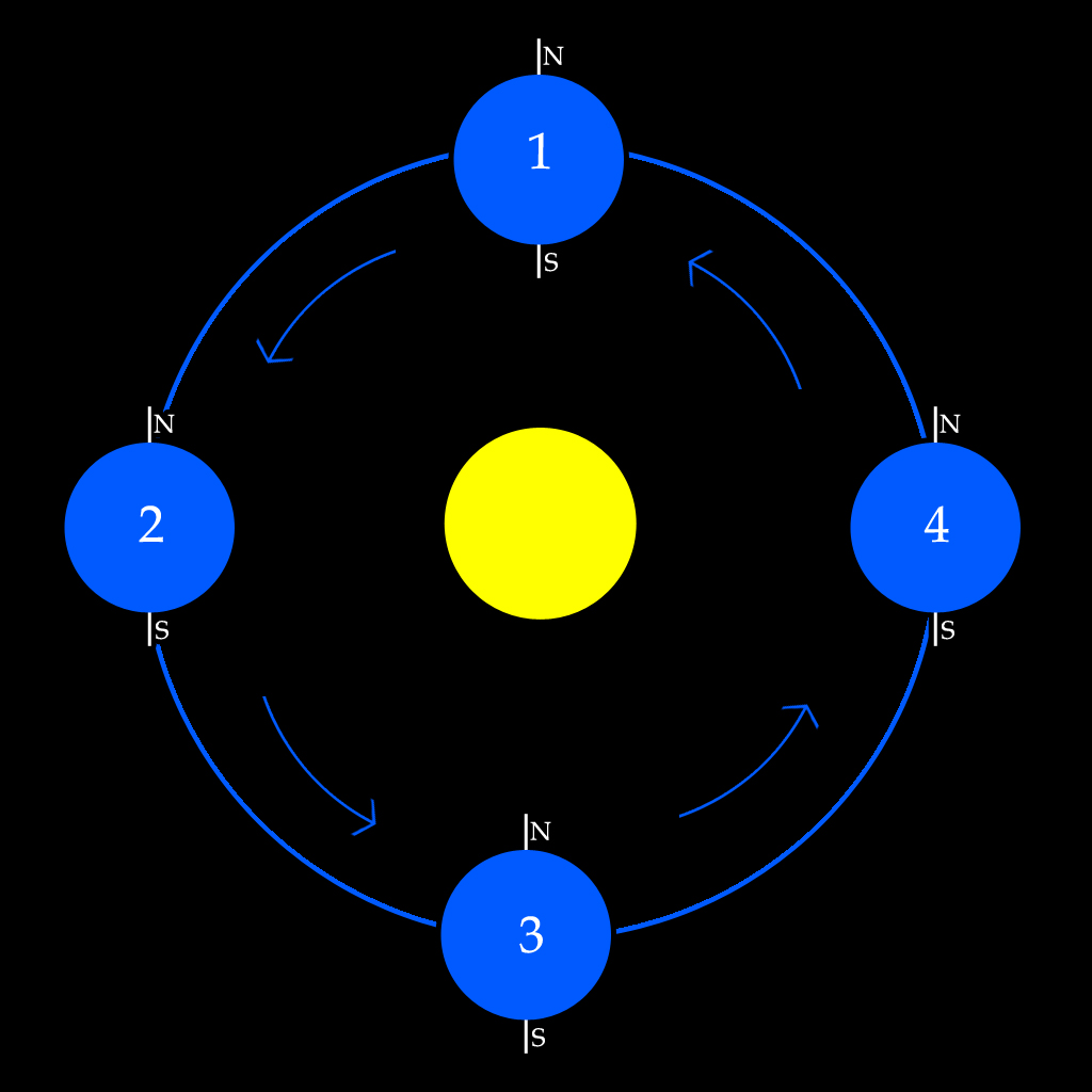 At point 1 in its orbit, Uranus has its North pole pointing away from the Sun (and thus, in total darkness), whilst the South pole is pointing toward the Sun, and thus, experiencing perpetual daylight. After 21 years, Uranus has moved to point 2 in its orbit, where the axis is now pointing parallel to the orbital tangent, and consequently, North and South poles both experience equal day and night lengths. After another 21 years, Uranus has moved to point 3 in its orbit, where the North pole is now pointing toward the Sun (and expriencing perpetual daylight), whilst the South pole now experiences perpetual darkness. After another 21 years, Uranus has moved to point 4 in its orbit, and once again, both poles now experience equal day and night lengths. Finally, after another 21 years, Uranus returns to point 1, and the cycle begins all over again.
