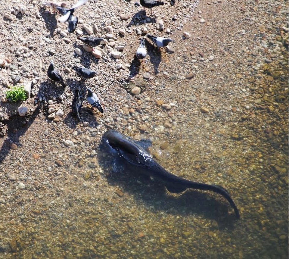 These catfish live in the River Tarn (in the city of Albi) which contains a small gravel island. Pigeons come here to clean themselves, but unfortunately for them the catfish population has adapted to this food source. They have developed a strategy of lunging out of the water, grabbing a pigeon and wiggling back into the river. This behaviour is reminiscent of the way bottlenose dolphins and killer whales sometimes hunt, so much so that the researchers (University of Toulouse, France) refer to these catfish as "freshwater killer whales" in the title of their paper.