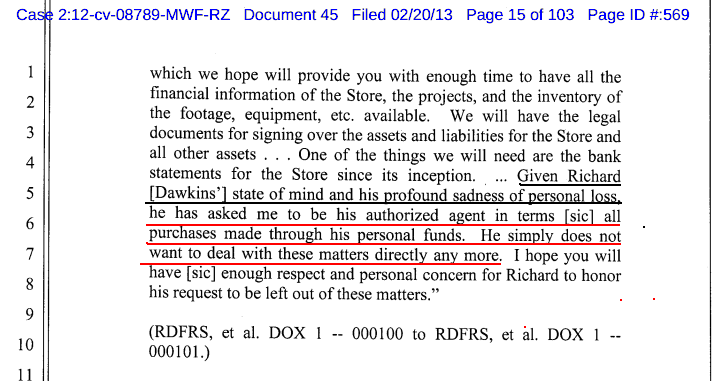 24. Timonen proposed to Dawkins that Timonen could donate certain profits of the Upper Branch Store operation to RDF. In response, on or about July 25, 2007, Dawkins emailed Timonen in Los Angeles: “it’s your baby, your profits, your tax . . . as for whether Upper Branch should make a donation to RDF[], I don’t think you should feel any moral obligations in that regard.”