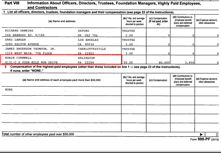 Robin Elisabeth Cornwell's putative current place of residence is shown on page 6 of RDF's 2010 Annual Return (which is also available to download from Guidestar):