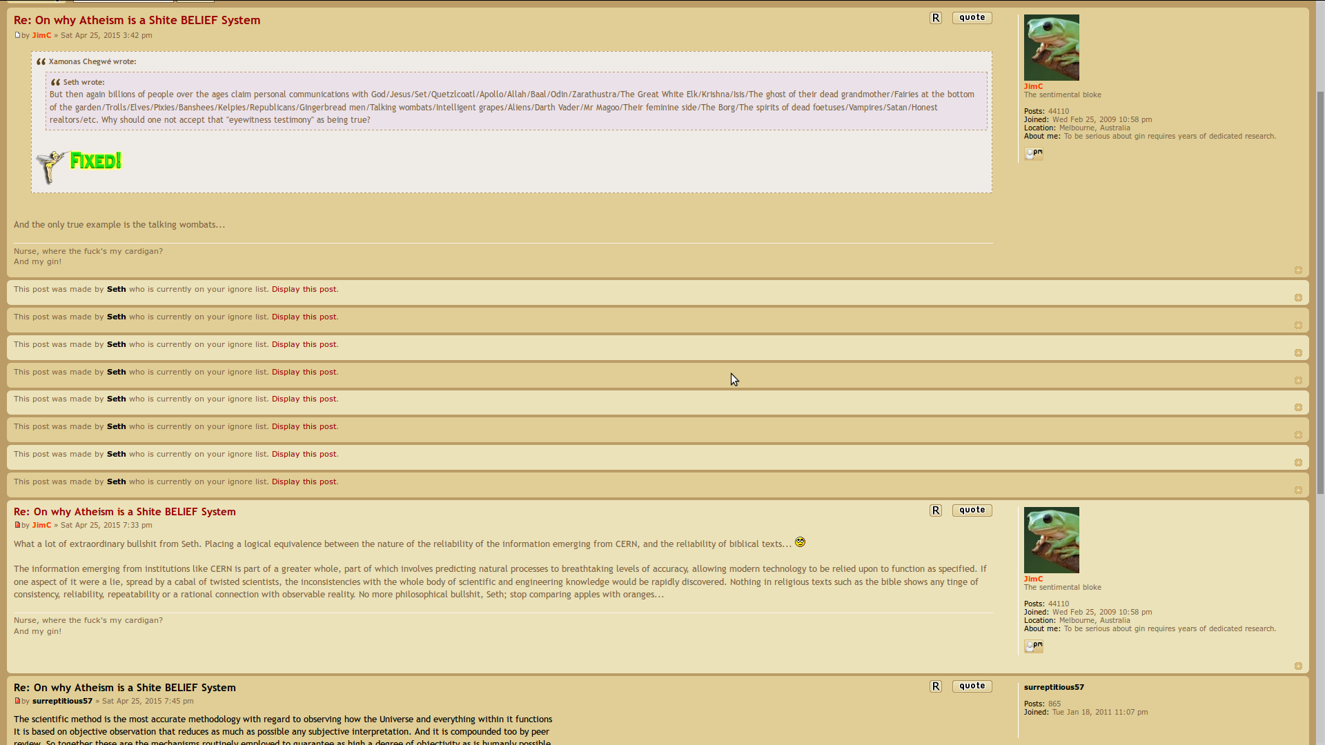 And the only true example is the talking wombats...Xamonas Chegwé wrote:Seth wrote:But then again billions of people over the ages claim personal communications with God/Jesus/Set/Quetzlcoatl/Apollo/Allah/Baal/Odin/Zarathustra/The Great White Elk/Krishna/Isis/The ghost of their dead grandmother/Fairies at the bottom of the garden/Trolls/Elves/Pixies/Banshees/Kelpies/Republicans/Gingerbread men/Talking wombats/Intelligent grapes/Aliens/Darth Vader/Mr Magoo/Their feminine side/The Borg/The spirits of dead foetuses/Vampires/Satan/Honest realtors/etc. Why should one not accept that "eyewitness testimony" as being true?