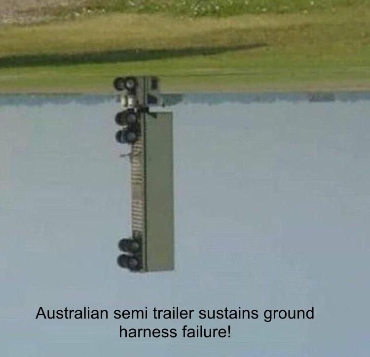 Fake news. Australian trailers run on triaxles. This one is a US 18-wheeler so embarrassed that someone stuck a MAGA sticker to its bumper that it tries to disappear from the face of the earth by drilling itself through its surface.