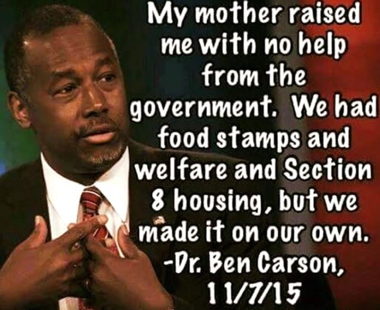 Denying social welfare programs on the grounds that it encourages its recipients to stay in squalid poverty is one of those absurdities presented by conservatives all over the world, but it seems particularly prevalent in the USA. In my 47 years as an adult I have met exactly one person whose ambition was to live like that for the rest of his life. He was in his mid-thirties and wanted to live on the dole in a caravan up the central coast north of Sydney, and do nothong but go fishing and get stoned while any sickness or injury will be taken care of by socialised medicine. To get rid of the social safety net for the sake of a teensy-weensy minority is not only absurd. It is utterly inhumane and unjust. In Carson's case it could be argued that there's an element of hypocrisy as well.