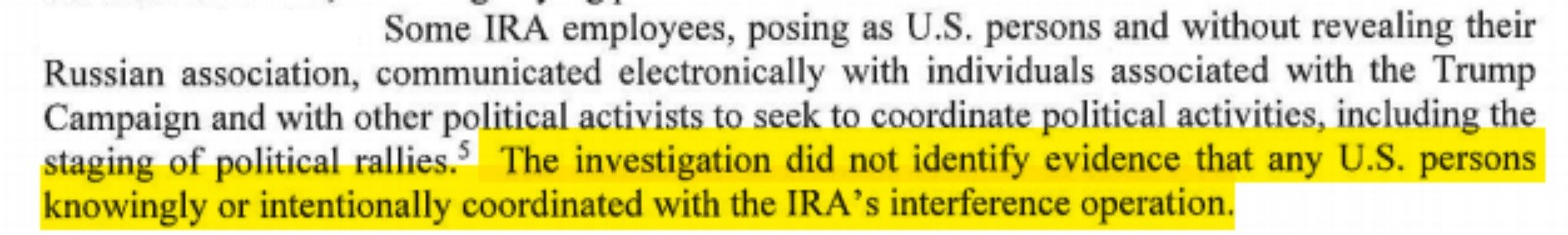 According to Mueller, not only did Trump and the Trump campaign not collude with the Russians, neither did any other American.