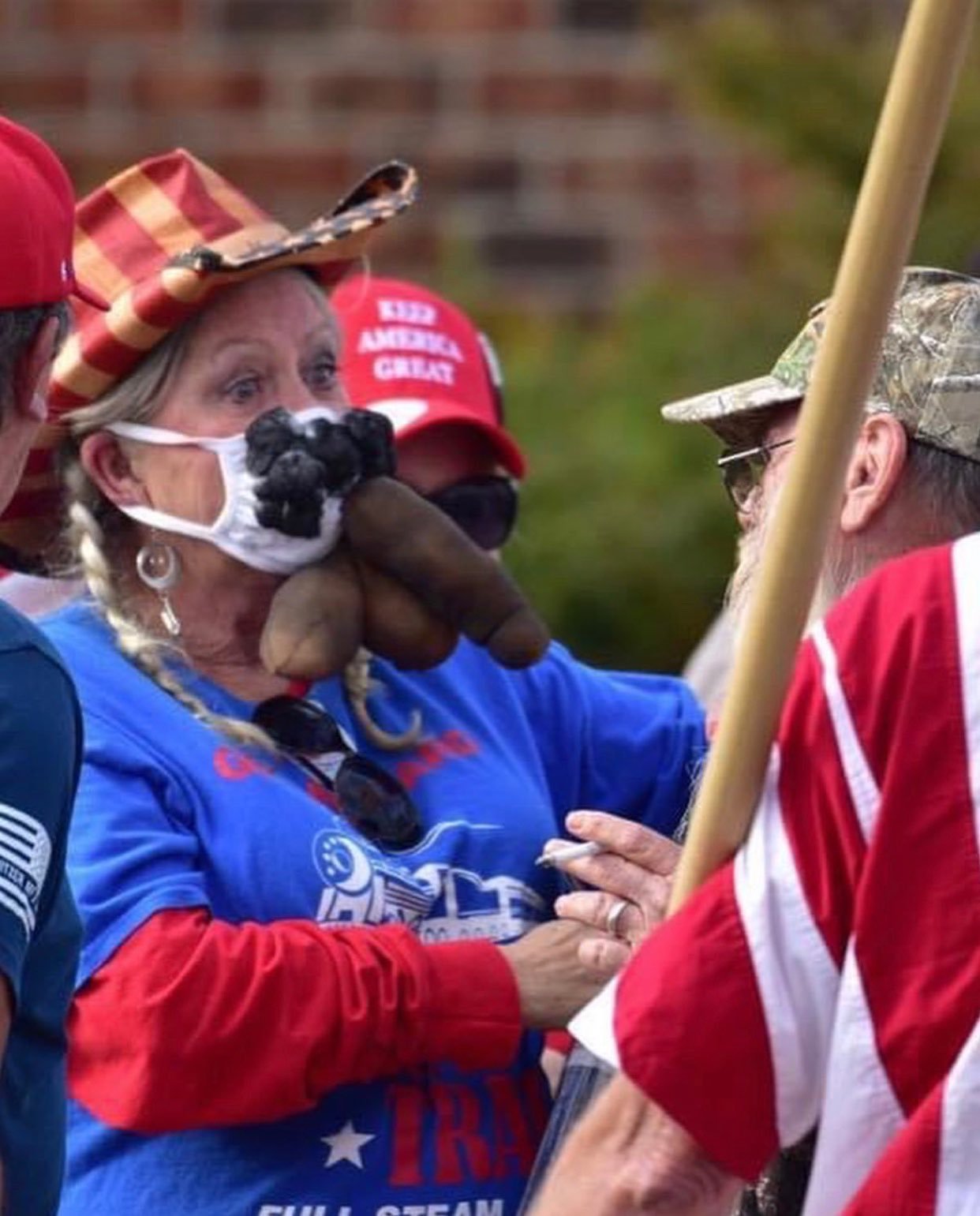 The crowd also waved flags including “Trump 2020: Keep America great”, “Trump 2020: No more bullshit”, “All aboard the Trump train!” and “Trump 2020: Pro life, pro God, pro gun”. A stand had been set up to sell merchandise, as if at a Trump rally. Some ran excitedly after the motorcade. There were chants of “USA! USA!”, “We want Trump! We want Trump!” and “Four more years! Four more years!”
