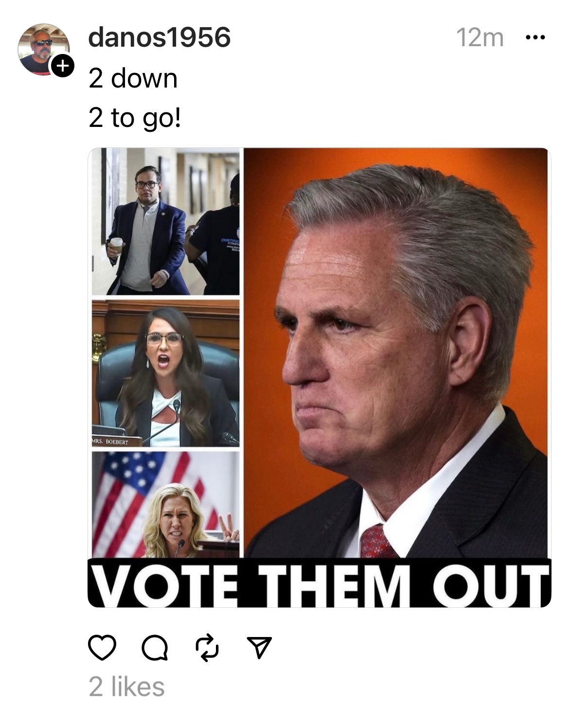 https://www.newsweek.com/kevin-mccarthy ... te-1850342In a video posted on McCarthy's X page in September, he can be heard telling reporters: "I never quit." He added: "I'm not working for some member sitting in our conference. I'm working for this country and I am never going to give up on the American people. I'm going to work every day and you know what? If I come up short today I'm going to work harder tomorrow. That's what I do."