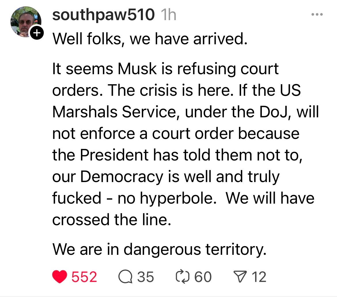 Donald Trump’s cronies are threatening to defy the authority of the federal courts. If they follow through, the nation’s rapid descent into dictatorship will be complete, and the risk of the first challenge to the legitimacy of the federal government since the Civil War could soon be upon us.
