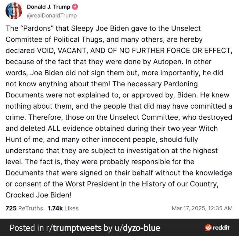We went to sleep in a democratic Republic. We woke up in a fascist state. That is how I feel after reading this AM Trump has openly violated federal court orders and declared that all pardons President Biden issued to those involved in Jan 6 investigation are now "void." Trump has now vowed to prosecute people Biden pardoned for investigating his Jan 6 related crimes. If you read about this is another country, you'd say the nation was on the path to dictatorship. You'd be 100% correct.