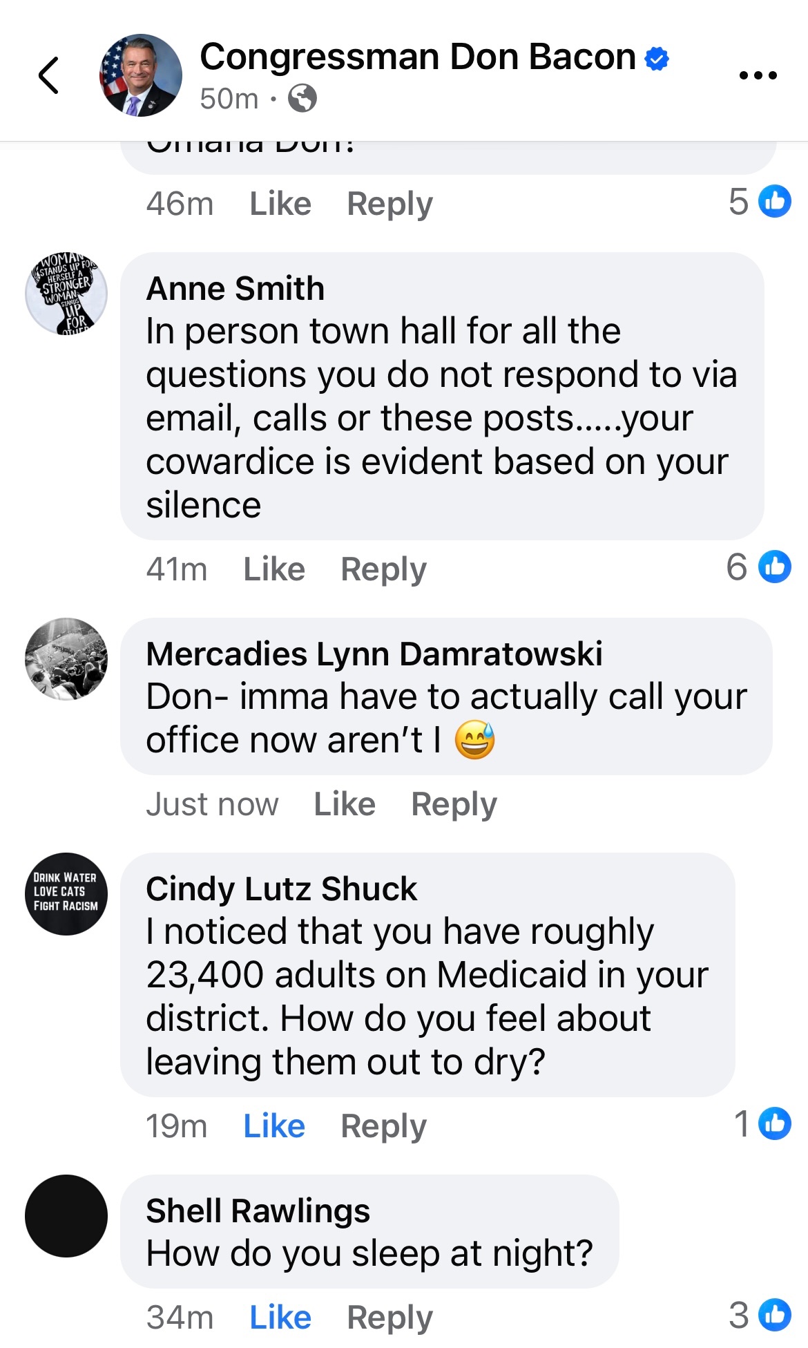 Our state only has 3 in congress. Mr Bacon is carrying out business as usual. This is his FB and this is what a town hall would sound like.