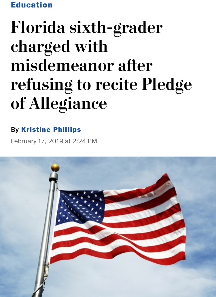 The 11-year-old refused to recite the pledge, telling his teacher that he believes the flag is racist and America’s national anthem is offensive to black people, according to a Bay News 9 report that cited a statement that the teacher gave to district officials. The teacher, who was substituting at Lawton Chiles Middle Academy in Lakeland, Fla., then had what appeared to be a contentious exchange with the sixth-grader.