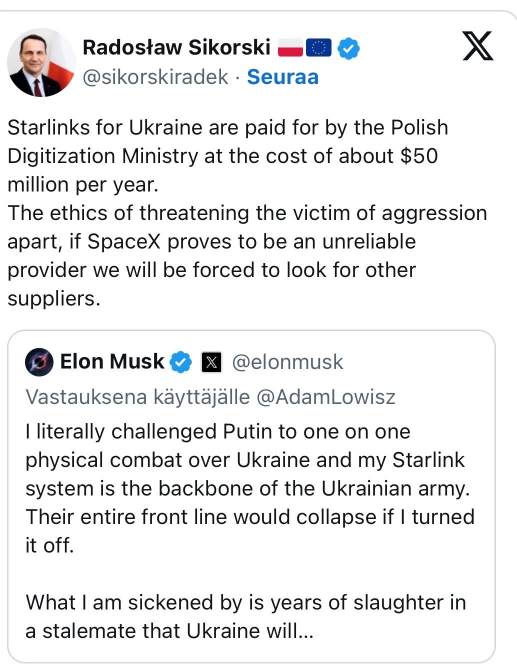I started to write this Kari story where Musk sends his sperm to Ukraine and demands the ultrasound of 100 Ukrainian women pregnant with his sperm. Before he turns Starlink back on. But it was not funny.