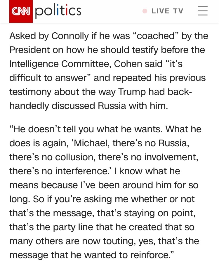 “In conversations we had during the campaign, at the same time I was actively negotiating in Russia for him, he would look me in the eye and tell me there’s no business in Russia and then go out and lie to the American people by saying the same thing,” Cohen will say. “In his way, he was telling me to lie.”