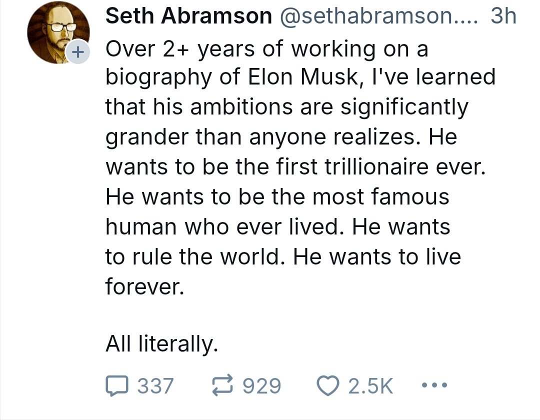 1% of $56bn is $560,000,000 btw. Dividing Musk's pay between Tesla's c.120,000 employees ≈ $466,667 each.