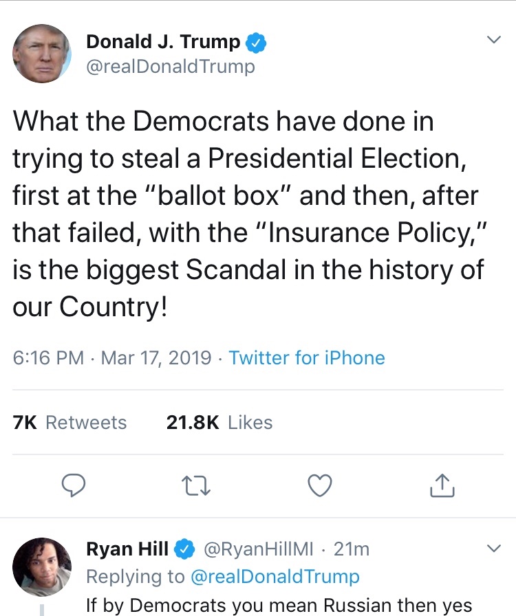 Yeah, because there was nothing to throw.L'Emmerdeur wrote: ↑Sat Mar 16, 2019 7:34 pmCute, except Mueller hasn't actually thrown anything at Trump.