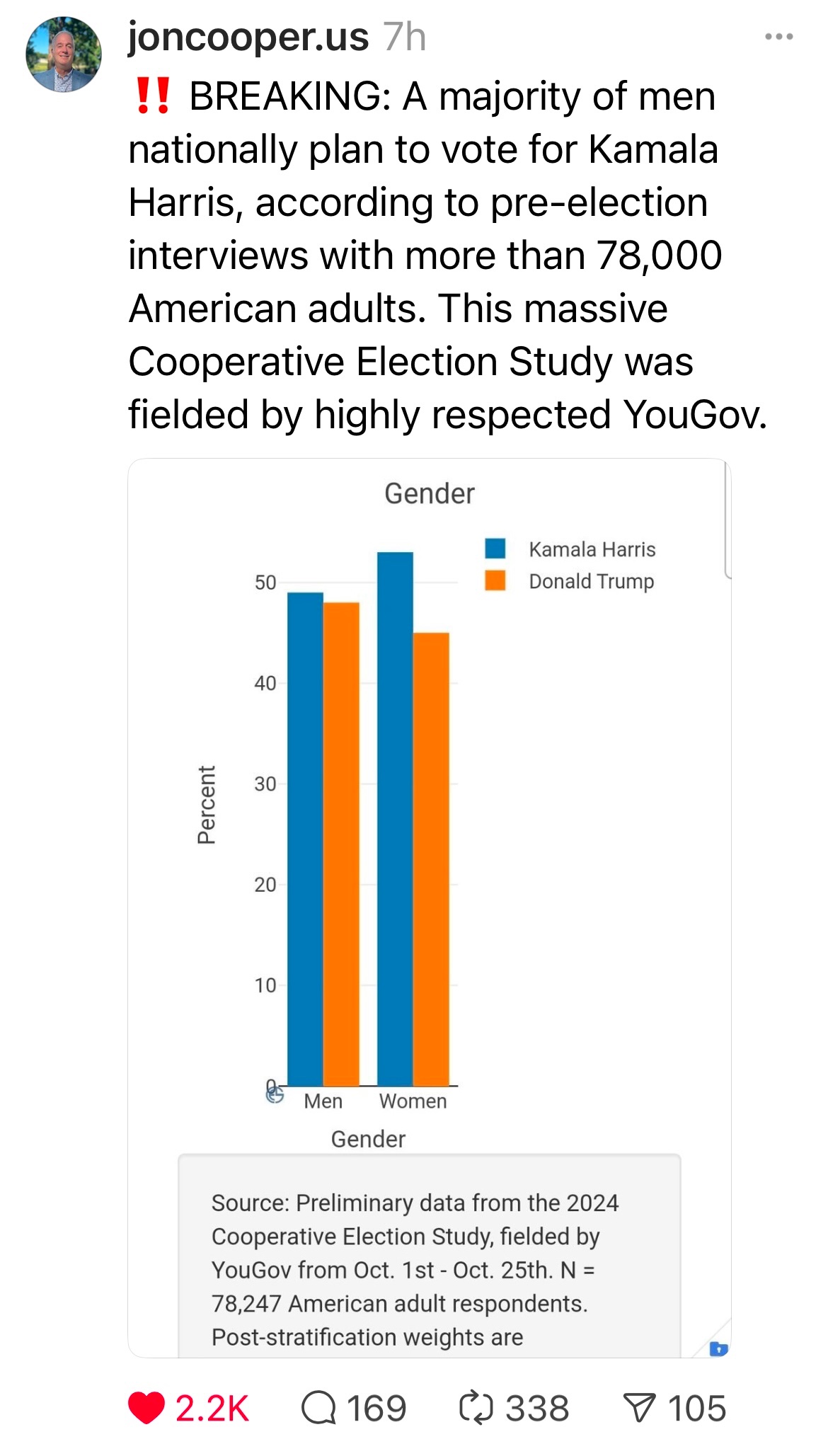It was predicted that men would vote for Trump. Like by 10%. Most recent data seems to indicate Trum lead there not happening.