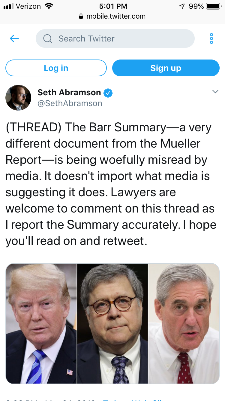 And the obstruction of justice thing may not be completely put to bed. As the video Forty Two linked noted, Mueller explicitly didn't exonerate Trump of obstruction, he left it to Rosenstein and Barr to decide whether to prosecute.
